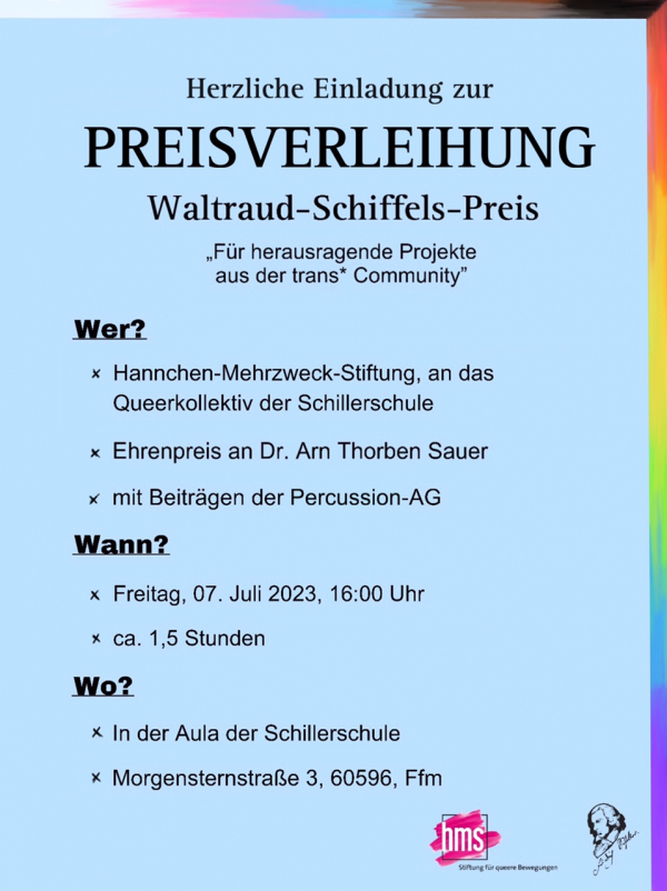 Der mit 1.000 Euro dotierte Waltraud-Schiffels-Preis für herausragende Projekte aus der trans* Community geht an das Queerkollektiv der Schillerschule in Frankfurt/Main. „Beim Queerkollektiv handelt es sich um ein kleines, mutiges und strahlkräftiges Projekt, geführt von jungen, engagierten Jugendlichen, das sicherlich größte Anerkennung verdient.“ waren die Worte, mit denen Heik Zimmermann das Queerkollektiv vorgeschlagen hat. Es ist uns - der Stiftung und der Zustifterin - eine Ehre, den Jugendlichen mit unserem Preis diese Anerkennung geben zu dürfen.