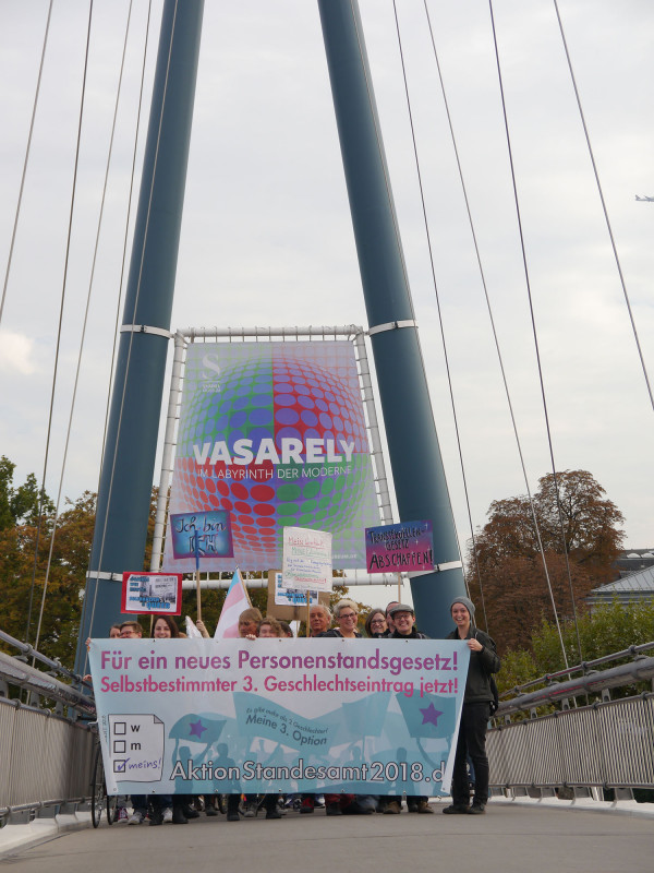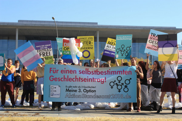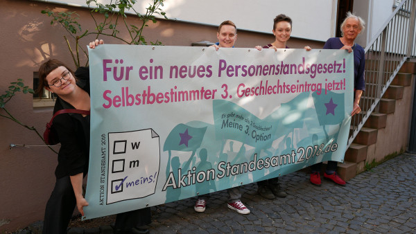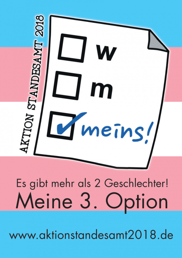 Die geschlechterpolitische Kampagne Aktion Standesamt 2018 gründete sich im Dezember 2017 als Reaktion auf den BVerfG-Beschluss zur sogenannten dritten Option. Nach diesem historischen Urteil war es oberstes Ziel, den Gesetzgebungsprozess kritisch zu begleiten und öffentlichen Druck auf die Gesetzgeber*innen für eine möglichst anti-diskriminierende Neuregelung des Personenstandsrechts aufzubauen. Es ging darum, die Sichtbarkeit der Anliegen von nicht-binären inter* oder/und trans* Personen zu stärken und die Vernetzung von nicht-binären Gruppen innerhalb Deutschlands zu unterstützen. Als zentrale Forderung wurde ein selbstbestimmter Geschlechtseintrag für alle Geschlechter, der ohne große bürokratische Hürden beantragt werden kann, bestimmt. Im Detail orientierten sich die Forderungen an dem Gutachten ‚Geschlechtervielfalt im Recht‘ des Deutschen Instituts für Menschenrecht.